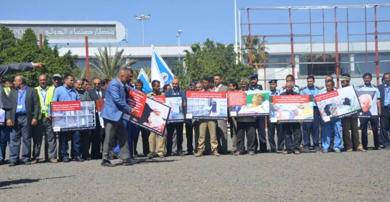 وقفة بمطار صنعاء الدولي تندد باستمرار العدوان