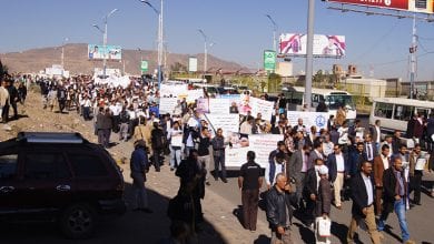 مسيرة ووقفة أمام مكتب الأمم المتحدة بصنعاء للتنديد بإغلاق تحالف العدوان مطار صنعاء و حصار ميناء الحديدة
